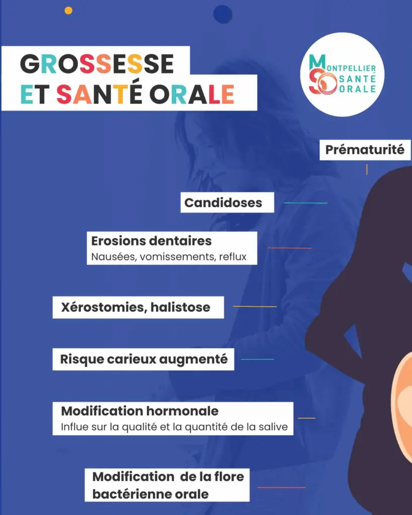Les pathologies bucco-dentaires chez la femme enceinte sont celles que l’on retrouve dans la population générale mais elles peuvent être accentuées par les modifications physiologiques (hormonales, salivaires, bactériennes, immunologiques) et peuvent aussi avoir des conséquences sur l’enfant à naître.
